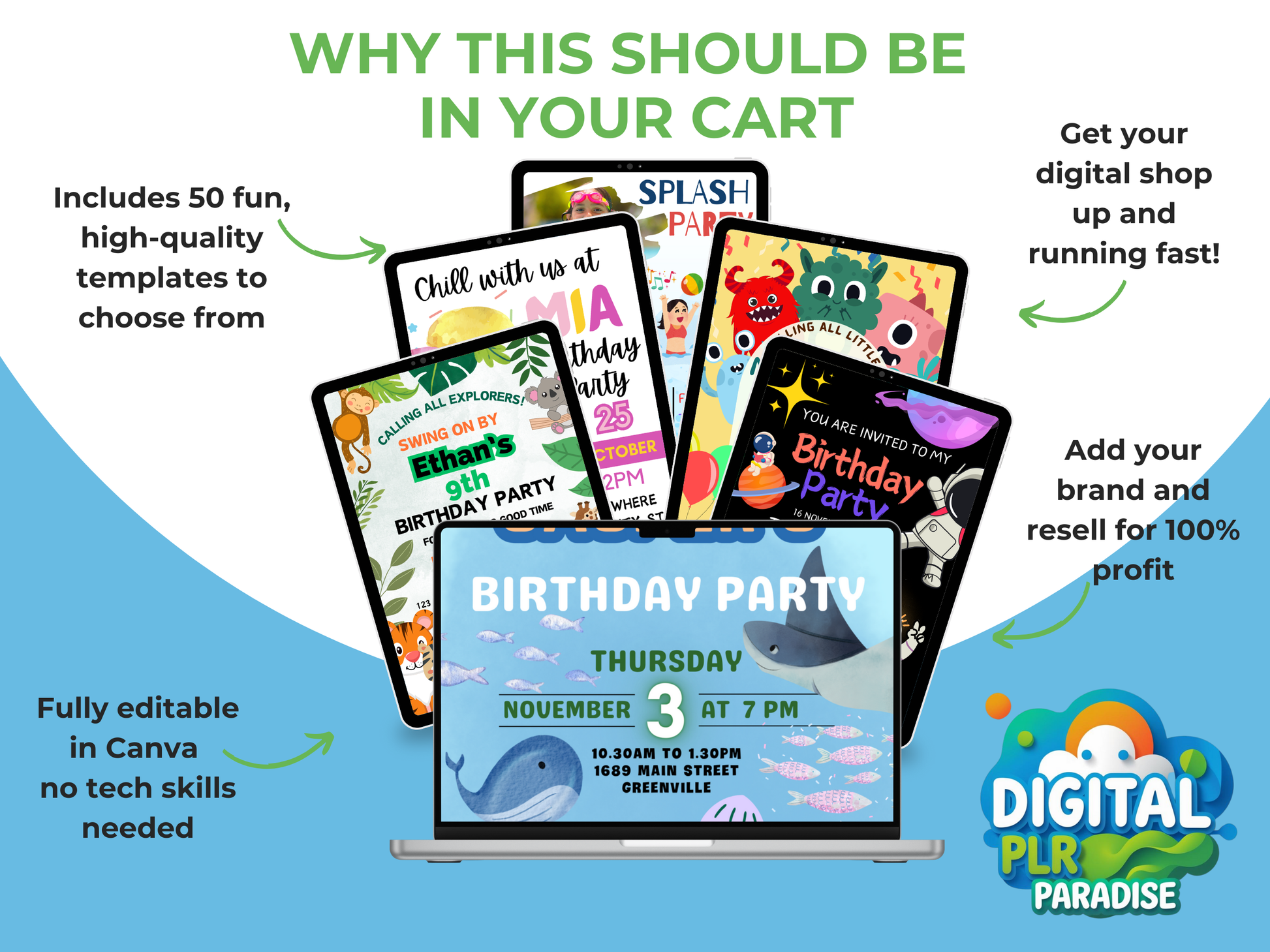 50 Editable Kids Birthday Invitation Templates | Canva Templates | Instant Download | Birthday Party Invites | Resell with PLR